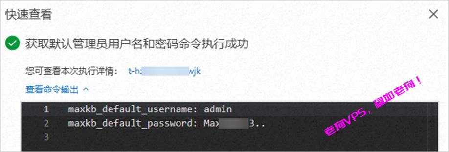 在图中③区域,单击快速查看,在弹出的快速查看对话框中,获取MaxKB默认管理员用户名和密码。