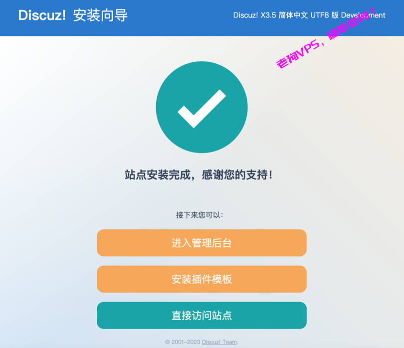 安装完成后,单击直接访问站点,即可访问论坛。建议您立即登录后台管理界面,进行基本设置和安全管理。